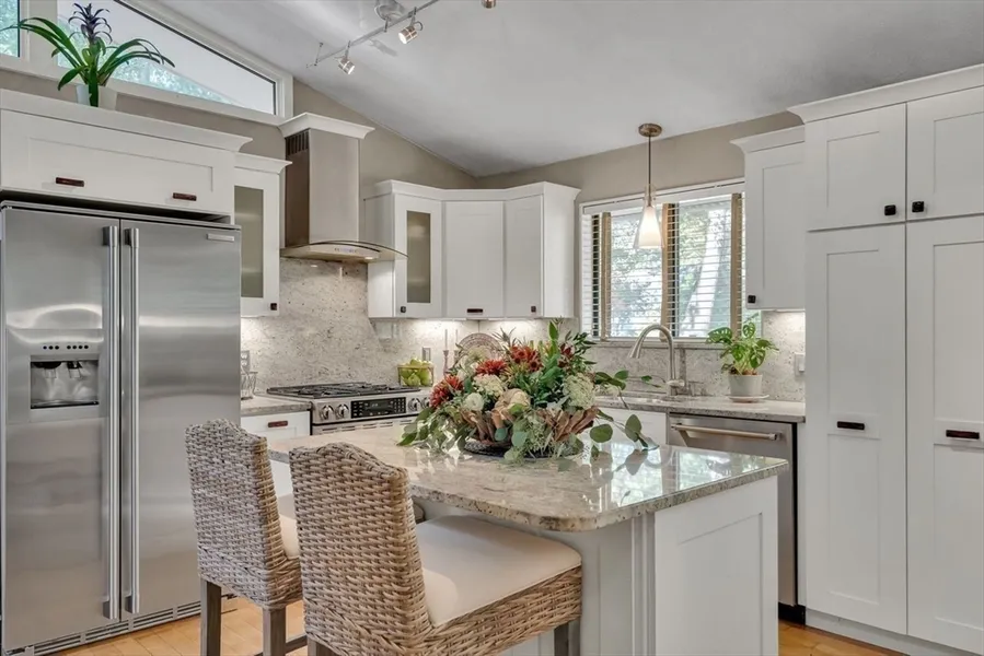 Welcome to 6 Westward Circle, a stunning home in one of North Reading's most sought-after neighborhoods, located at the back entrance of Hood Elementary School. This meticulously maintained property is perfect for families and entertaining. Inside, you'll find an updated kitchen with a charming dining area, and a spacious living room with a cathedral ceiling and a floor-to-ceiling river rock wood-burning fireplace. French doors lead to a large screened-in porch, ideal for outdoor gatherings. Outside, a newer attached porch overlooks 1.25 acres of landscaped yard bordering conservation land-great for barbecues and sunset dinners. The main level features a spacious primary bedroom with a spa-like ensuite, plus three additional bedrooms and two full updated bathrooms. The huge family room with another fireplace and walk-out slider adds space and convenience. Recent updates include a Brand n...