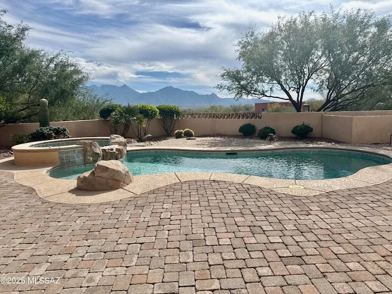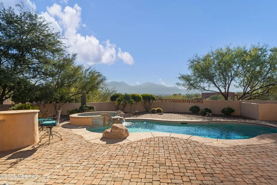Exquisite gated Santa Barbara Ranch-style estate showcasing the pinnacle of Southwest elegance with unobstructed, panoramic views of the Santa Rita Mountains. Every detail of this home reflects thoughtful design, luxurious craftsmanship, and the seamless integration of indoor and outdoor living, offering a rare lifestyle of privacy, serenity, and refined entertaining. Enter through a tranquil courtyard featuring a classic fountain and Southwest-tiled gas fireplace, connecting gracefully to the foyer, office/den, primary suite, and guest accommodations. The courtyard sets the tone for the home's signature indoor/outdoor flow, inviting natural light and sweeping mountain vistas throughout the main living spaces. The gourmet kitchen is a chef's dream, featuring a Wolf six-burner gas stove, Sub-Zero refrigerator, expansive island with breakfast bar, and premium custom cabinetry. A wet bar wi...