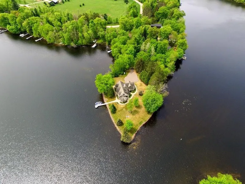 NEW PRICE! One in a million, thats exactly what this incredible property is! Sitting on a 1.25 acre lot, over 800ft of shoreline & a captivating 180 degree water view, nothing compares to this private peninsula. Sharing frontage on both Chain & Clear Lake sits this architecturally beautiful stone estate. Featuring 3br, 2 1/2 bath, bright sun room, formal dining room, Living room with eye catching two story fireplace & impressive 2nd floor den all with sweeping water views. Landscaped yard, boathouse and detached garage add to everything else this one has to offer.