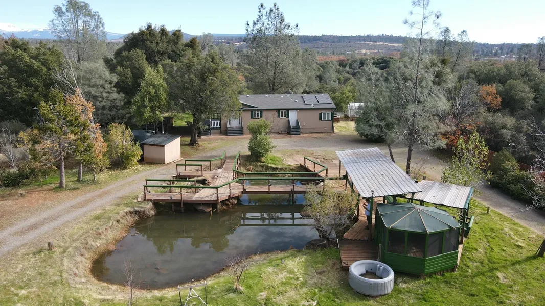 Peaceful and quiet property with views of Mt. Lassen. You can hear the Battle Creek from your porch. 2006 MFD on a permanent foundation. Open floor plan with a large kitchen. Vaulted ceiling. Circular driveway sweeps around the property. The Property contains, owned solar, a huge shop and two ponds. The charming covered deck juts out over the water offering a peaceful retreat.A few chairs are on the deck, inviting anyone to sit and take in the view.A bridge arcs over the pond creates a perfect frame for the sunset. The serene beauty of the pond, the deck, the bridge, and the gazebo forms a perfect harmony, where nature and calm coexist in quiet splendor. Must See