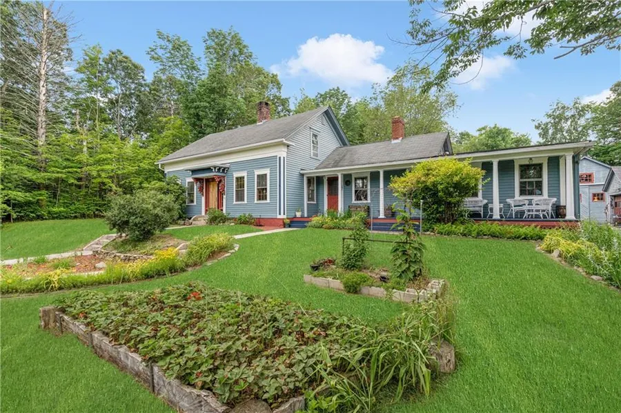 This home is on a country road set above a stone wall that opens an expansive driveway to a private rear oasis. The first floor has all original, reglazed windows with wavy glass and herringbone-patterned hardwood flooring. A fireplace graces the family room, leading to the front farmer's porch, and a first-floor bedroom has a private entry. The kitchen is bright and airy, with exposed ceiling beams and transom windows. Beadboard cabinetry hides modern conveniences and unique custom features. Also featured are the dining room and office with a built-in corner cabinet and bookshelves and a bathroom with laundry on the first floor. The front-to-back living room has a French door that beckons you to the edible gardens, fruit trees, and perennials. Upstairs features three bedrooms, including the sizeable primary bedroom with two closets and another charming bathroom with a claw foot tub and shower stall with radiant heat. Car enthusiasts will appreciate the heated 40x24 barn with a car lift and electric winch; it can house 3-4 cars and has a full loft. There is also a 1 1/2 car garage and a rock shed. The lot is a peaceful 1 1/4 acres and offers quiet areas to rest and reflect. The lot has the potential to subdivide.