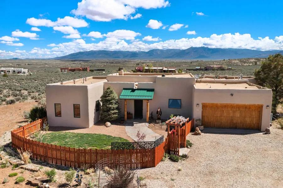 Welcome to this charming southwest style home with incredible views sitting on approximately 1.26 beautiful acres. Entering the property, you are greeted by a thoughtfully landscaped driveway and garden area including fruit trees and a fenced in yard for your furry friends. As you enter the home, there is an open plan living, dining and kitchen area with high T&G ceilings with vigas accents. The living room has a feature kiva style fireplace to cozy up while you watch the snow on winter days. The kitchen is well equipped with stainless appliances which includes a newer large refrigerator & vent-hood over the range. Split floor-plan style ensures the primary suite has plenty of privacy as is off to one side of the home. Primary suite has a walk in closet, spacious bathroom with separate shower and bath, the room also has a door to the back covered patio. On the other side of the home are the two guest bedrooms and the guest bath. The back patio captures the treasure of Taos; wonderful views of the mountains. This lovely enclosed area has a stucco wall which opens up through a gate to another outdoor living space including a fire pit area. Home has an attached two car heated garage, in-floor radiant heat, mini-split system providing both heat & cooling and a built up parking area to the side of the house that can be used for additional parking.