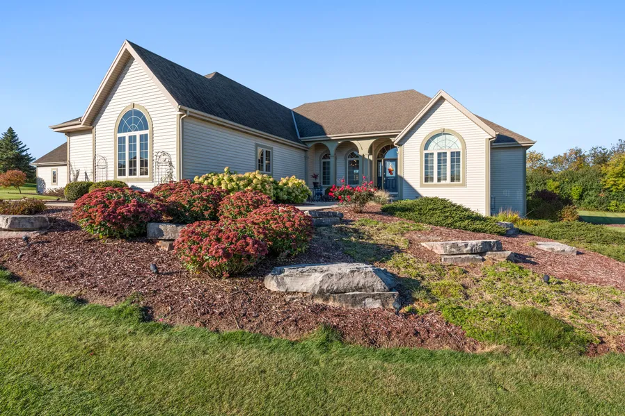Custom-built ranch on cul de sac in Richfield's coveted Winchester Fields subdivision. Split ranch featuring cathedral ceilings in great room and 9 ft ceilings throughout home. Remarkable layout with large master bedroom including trey ceilings, walk-in master closet, and XL walk-in shower with dual shower heads. Relax in open concept living area with hardwood floors, gas fireplace, spacious kitchen with plenty of counter space, and a sun-drenched sitting area off the kitchen. Main floor includes home office with french doors, first-floor laundry with 3 bedrooms and 2 bathrooms. Extensive storage throughout the home with stairway to loft in heated 2nd garage. Matured landscaped backyard oasis including two tier patio with fireplace and seat wall perfect your entertaining needs.