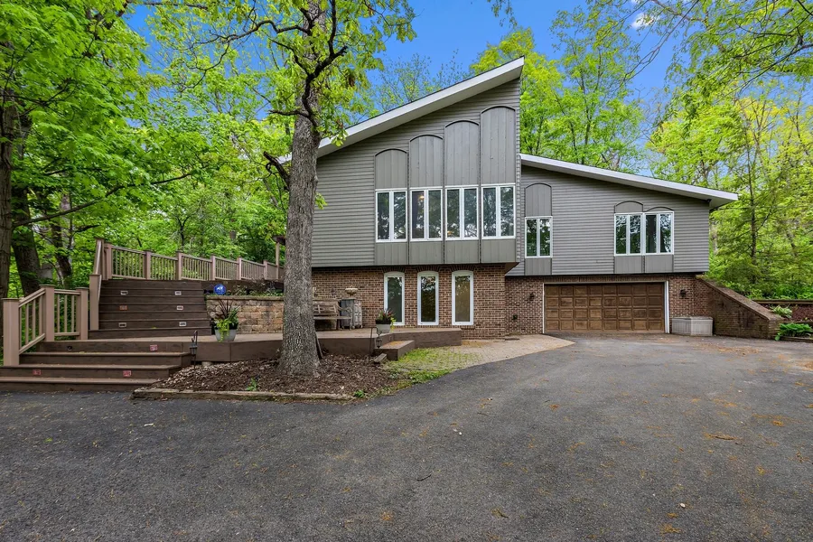 Contemporary home designed by a student of Frank Lloyd Wright. Nestled on top of a heavily wooded, 1.27 acre lot with sweeping nature views from every window. Main level features modern exposed brick, newly refinished hardwood floors, updated bathroom, and an open floor plan. Recently remodeled kitchen with granite countertops, white cabinets, SS appliances, large island, and a huge walk-in pantry. Master bedroom boasts hardwood floors and a wall of large windows with amazing hilltop views. Skylights pour natural light into two large dormer bedrooms upstairs with a recently remodeled bathroom. Spacious walk-out basement includes an office, rec room, and mud room. Outdoor space includes Timbertec deck, hot tub, firepit, perennial gardens, and plenty of yard space for outdoor entertaining. Recent updates include refinished hardwood floors, remodeled basement, exterior paint, and asphalt dr...