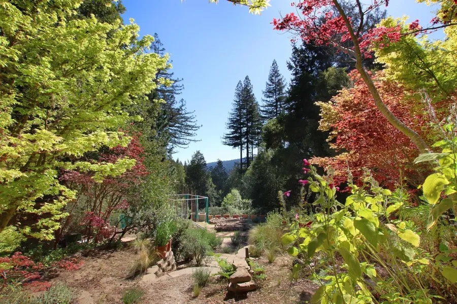 Behind the gate is a fully fenced yard with an impressive Oak tree by the portico that leads to this home's entrance and the studio apartment to the left. Inside are LV Plank floors, open ceilings, a fireplace, and a spacious kitchen with an open dining and living area. The bedrooms have exterior doors leading to the 600 SqFt deck with planter boxes, a spa, gazebo shaded by wisteria vine with views of the garden and mountains beyond. There is a laundry area, loft, double closets, built-ins, and a separate gym structure that could be an office. Plenty of parking. Outside you're welcomed through the archway to meandering paths into the terraced gardens complete with sprinklers for native plants, popular perennials, multiple varieties of Japanese Maples, and cozy sitting areas amongst the flagstone pavers. Your garden experience will be enriched by the small greenhouse, potting shed, well f...