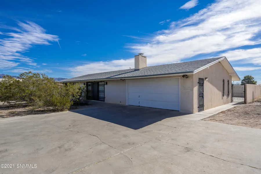 This rare find located in the desirable Las Alturas area features 1,518 square feet 2 BR, 2.5 BA, 2 car garage, and a pool. Natural light is abundant throughout the home and access to the outdoors from each bedroom and room in the house with sliding glass doors with security doors. The open floor plan has a large tile Living Room, Dining area, and impressive wood burning fireplace. The well-appointed kitchen is open to the Living Room which makes the space great for entertaining. The Kitchen has a large island, sitting area and slider out to the backyard and pool. The spacious Primary Suite has carpet and slider out to the backyard/pool. The large secondary BRs have large sliders out to the front patio. The generous laundry comes with the washer, dryer, utility sink, and has room for an office/desk area. The backyard has large in ground pool with automated cover and fantastic views of the Organ Mountains. The home sits on 1.29 acres and has RV parking and plenty of room for a shop.