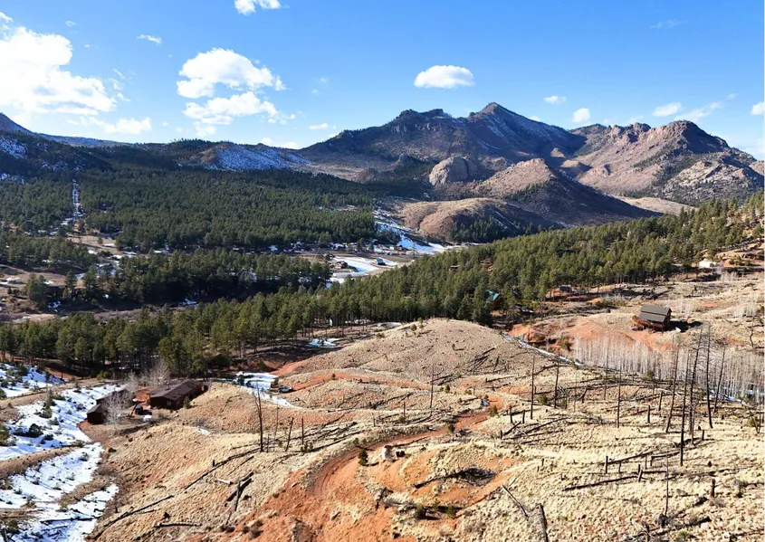 The area has stunning mountain views and a peaceful setting. Some trees show signs of past wildfire, but new growth is starting to return. Nearby, there are a few homes, a...