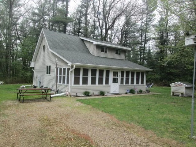 Recreational Retreat calling all buyers! Be the first one in line to get this 2 BR, 1 Bath, 1.5 story vacation home! All very rustically completed! Enter thru the 3 season room where you and the clan can play games all night and all day! From there you enter into the large open living area with cathedral ceilings and the relaxing feeling of being away from it all. Large kitchen area with many cabinets. Split Bedrooms in the loft area overlooking the living area. Outside Firepit, 2 Car Detached garage, extra storage building all on appx. 1.38 wooded park like acres. Walk to Patricks Lake Park and go for a swim! Appx. 20 minutes north of Wisconsin Dells. Seller including most furnishings. Just Walk In and Enjoy! This won't last long. Don't Delay, look today!