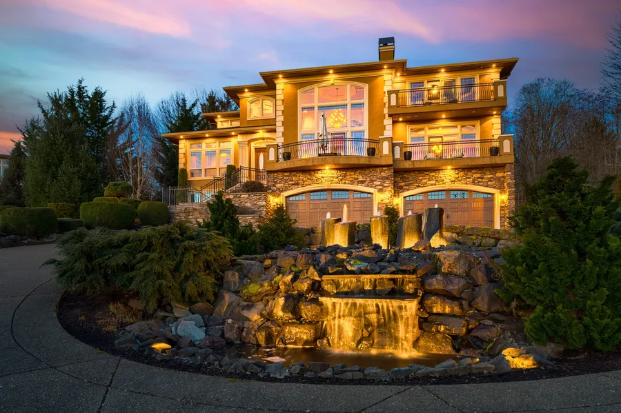 Upon arriving at the home you’re greeted by the large roundabout driveway circling a beautiful fountain beneath the large and elegant façade. Up the staircase, and through the double front doors you enter the great room with detailed high ceilings, intricate woodwork, a wood-burning fireplace, and a sliding door to the balcony showcasing the incredible view reaching as far as the Portland skyline.