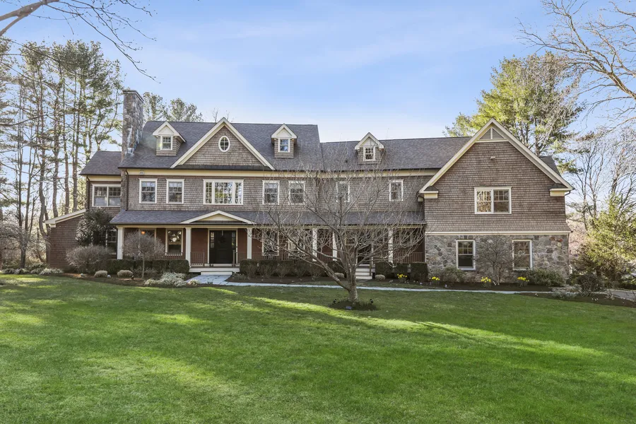 Sophisticated custom stone and shingle style Colonial located at the end of a cul-de-sac. A sun-filled bespoke interior offers timeless features and chic appointments: rich inlaid flooring, 2-story foyer with sweeping staircase, extraordinary millwork and craftmanship embracing every informal and formal room, hand-selected stones, custom paneled study, high ceilings and elegant lighting. A gourmet eat-in-kitchen featuring 6 burner range, pot filler, SubZero, (2) dishwashers, multiple built-ins and walk-in pantry flows into the family room with stone wood-burning fireplace. 5 bedrooms include 3 ensuite, 1 Jack-n-Jill and a luxurious master suite with marble surround gas fireplace, dressing/sitting room (or additional office) and bath with soaking tub and walk-in closet. Additional spacious upper level bonus room, as well as in-law/au pair suite with a full bath and walk-in closet. Large f...