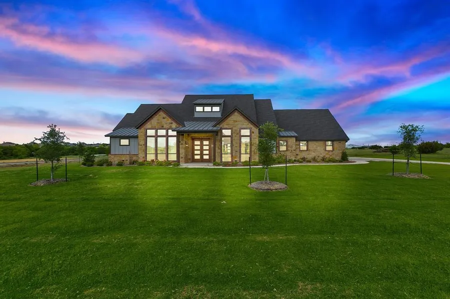 Beautiful 4 bedroom, 3.1 bath in Starlight Ranch Addition. Farm house-style kitchen with quartz countertops, double oven & decorative lighting. Living room features exposed wood beams, vaulted ceilings & brick wood-burning fireplace. Master bedroom is split from other bedrooms, perfect for some peace & quiet, with an en suite bathroom that boasts separate His & Hers vanities, garden tub, all glass waterfall shower. One of the bedrooms has its own private shower & toilet, making it a perfect set up for any guests! Utility room has a sink, built-in cabinets and mudroom. A fireplace in the outdoor living area with an option to add a TV makes for truly enjoying country living!