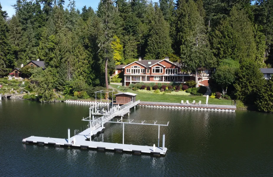 Sunbathed luxury waterfront retreat set on 1.3 acres, graced with 196 feet of pristine, Port Madison shoreline. The 6,204 square foot residence, with a three-car garage and shop; private guest cottage and deep water dock was completed in 2016 and has been lovingly cared for.