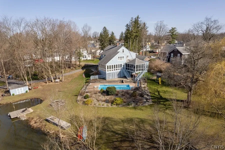 This property boasts 330 feet of water views of the Oswego River on a spacious 1.30-acre lot. With over 2600 square feet of living space, this meticulously maintained home offers three bedrooms, three full bathrooms, and a two-car attached in tandem garage. Step inside to discover a sunlit four-season room, large living room and formal dining room, all overlooking the picturesque water, perfect for relaxing or entertaining guests. Upstairs, there are three bedrooms, two of which are generously sized owner's suites complete with walk-in closets and a convenient second-floor dedicated laundry room. The heart of the home is the gourmet kitchen, featuring luxurious Corian countertops, stainless steel appliances, and a Butler's pantry. From the kitchen, step out onto the enclosed deck and soak in the stunning views of the heated in ground pool and waterfront! This home does NOT REQUIRE flood ...