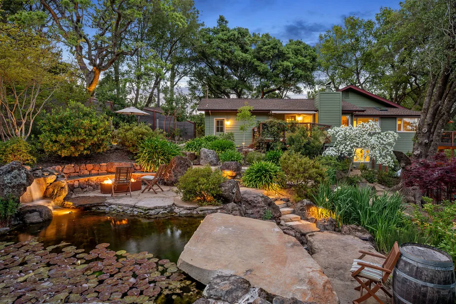 Tastefully updated 3 bedroom / 2.5 bathroom residence on a private 1.3 acre parcel in the desirable Diamond A neighborhood. Seen on the television series "The Pool Master", there is a stunning water feature with massive boulders, ponds, waterfalls, and lily pads. The home has been updated by the owner/contractor and you will be impressed by the great attention to detail and high quality of custom finishes. Interior features include hardwood floors, open beam ceilings, stunning Chef's kitchen, and master bedroom with fireplace. Multiple rooms designed for those who wish to work from home plus the detached office with bath. Majestic Oaks, mature landscaping, bocce ball court, and flagstone paths. Private and quiet yet close to everything with the Plaza being just minutes away. Instant relaxation when seated in this wonderland of nature and beauty. Originally a 4 bedroom home, perhaps there is potential expansion with the septic system. Located about 45 minutes north of the Golden Gate.