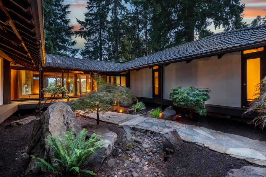 Stunning Willamette Riverfront retreat nestled in coveted River Estates Neighborhood, this epic one level custom home offers a picturesque serene lifestyle. Situated on 1.31 acres of waterfront, enjoy your own private dock & boat house plus full tennis court for pickle ball/tennis/bball! The interior showcases a harmonious fusion of traditional Asian and contemporary elements with the floor-to-ceiling stone fireplace taking center stage. The living/dining areas exude a sense of calm and quietude, providing the ideal space for relaxation and rejuvenation.The U-shaped custom design provides privacy and functionality with two distinct wings and a central connection point in the great room/kitchen area. The primary wing features a beautiful suite with ample closet space and updated bath, plus a library with rich built ins, all with breathtaking views of the Willamette River. The two-bedroom, two-bath wing includes a bonus room off each bedroom entry, perfect for accommodating the whole crew. There is an additional full bath for visiting guests! Outside, engage in friendly matches on the multi-sport court, which accommodates tennis, pickleball, and basketball enthusiasts. A matching auxiliary structure houses the well and offers ample storage or the potential to be transformed into a small guest space, adding versatility to the property. Attention to detail is evident throughout this retreat home. The front door is crafted by renowned artist Leroy Setziol. The original design for the entrance garden was created by landscape architect Robert Murase, known for his work on the Wilsonville Memorial Park. These artistic elements create a warm and inviting atmosphere directly from rich local history. Escape from the hustle and bustle of city life and embrace a River lifestyle where wide-open views of the Willamette River serve as your daily backdrop, discover the charm and allure of this serene oasis! Welcome Home!