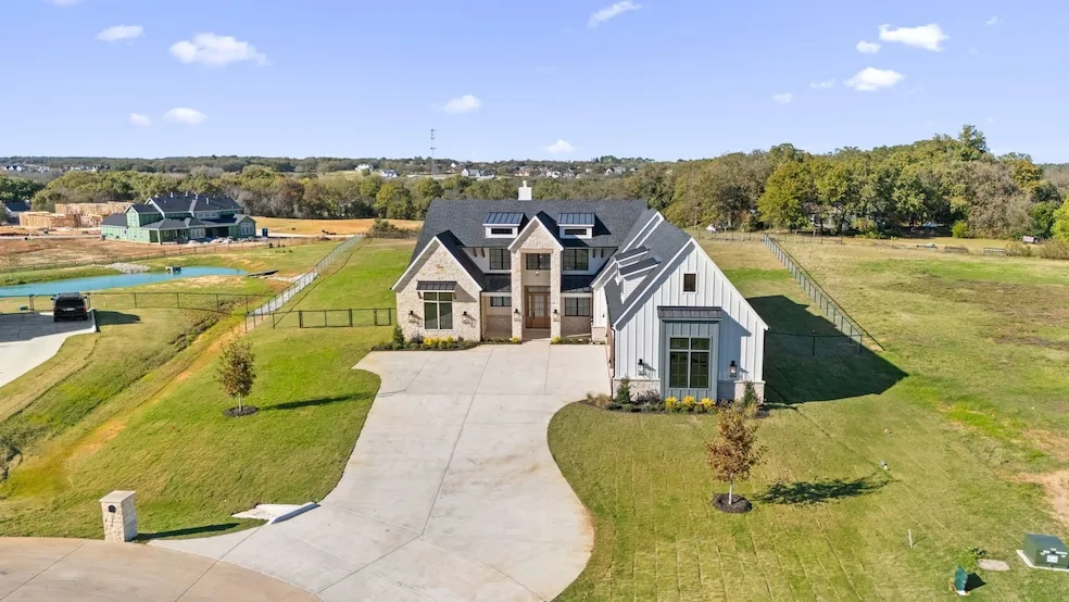 SELLER IS OFFERING A 2-1 RATE BUY-DOWN WITH ACCEPTABLE OFFER! This spectacular new construction is complete, and is amazing! This home is located in a bedroom community with no HOA and no City Taxes. Located just minutes from the heart of Argyle and city amenities in Argyle ISD but outside the city limits. Meander down Hunter Hill Lane to a world surrounded by trees and tranquility. Luxury local builder, Estates by Design, is the builder on this 5 bedroom master piece. Large primary with large walk in dressing room, spa like bath with 2 water closets. Guest suite is down with en suite and walk in closet. Executive study, large pantry with abundance of storage. This family friendly home has a place for everything and everyone! The open kitchen concept is a joy to spend time and cook with high end appliances, island seating and open to dining. Perfect for entertaining, open the sliding patio doors to double the size of the family room. Enjoy the views of your private backyard from your outdoor living and dining area. This space is complete with fireplace, outdoor kitchen and ample space for entertaining, lounging and views of a yard large enough for a resort style pool. The garage is a 4 car master piece! Install a lift if you like ooorrr build a detached shop on your beautiful 1.3 acres. You still have room for more! So much more to see... schedule your showing today.