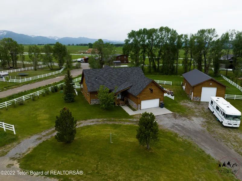Seasonal creek flows through this Bridger View Ranch property with a massive 26' wide by 50' deep RV Barn to house your Class A motor home and recreational toys! Less than a mile to golf, pickleball, swimming and ALL resort privileges. The home is surrounded by mature trees and landscaping and takes on a ''Ranchette'' style feel. Here is your chance to wake up to the sound of birds and a babbling brook in the spring and early summer months. Vaulted ceilings, massive faux river rock fireplace add to this four bedroom, three bath home on 1.31 acres just north of Thayne. Additionally, two covered porches for entertaining and lots of room to spread out give lots of versatility. This is a must see!!! The RV garage is over 1,300 square feet. This is a must see!!!