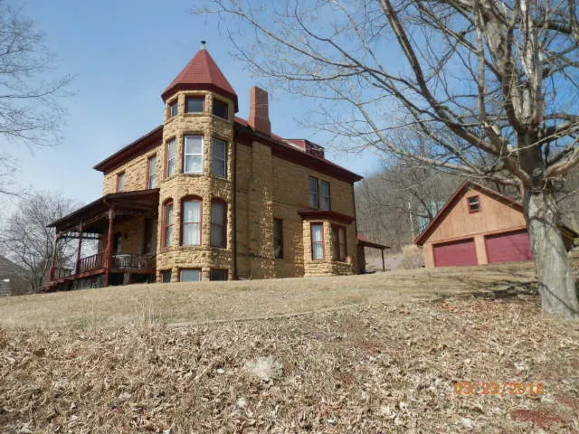 R-7443 CASTLE ON THE HILL: 4 bedroom, 2 bath stone Victorian home featuring 2 fireplaces, loaded with character to include open ornate staircase, hardwood flooring throughout, pocket doors, walk a bay window, unpainted period wood work, Queen Ann style Turret, Original style kitchen with island and pass through slide up door to dining room. Updated roof, furnace, hot water heater, electrical, new period style bathroom, summer kitchen/laundry room, 2 car detached garage, gazebo, with pond, nicely landscaped yard and blacktop driveway. Quality from the Past!