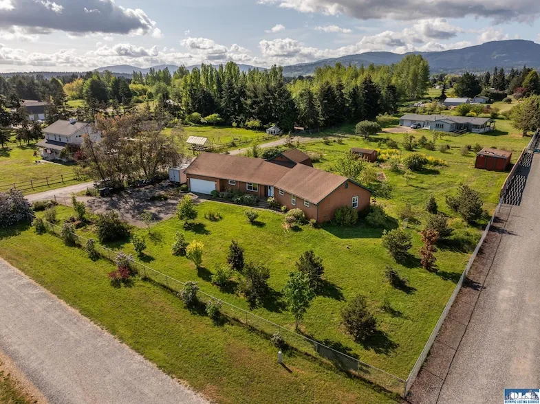 Welcome to your new sanctuary! This delightful property offers stunning, unobstructed views of the Olympic Mountains both inside and out. A uniquely shaped living room designed to highlight these breathtaking vistas, enhanced by beautiful hardwood floors that flow seamlessly throughout the main house. Spacious primary bedroom is a true retreat, featuring a generous walk-in closet & an ensuite bathroom, plus an additional closet for all your storage needs. Enjoy dining in multiple cozy areas, including French doors opening to a massive wood deck perfect for outdoor gatherings or simply enjoying a morning coffee with nature at your doorstep. A sprawling 1.3-acre fully fenced lot, this property is a gardener's dream! Discover a variety of gardening delights throughout the landscape, a small orchard & side yard with RV hookups, incl electric & septic for guests or weekend adventures