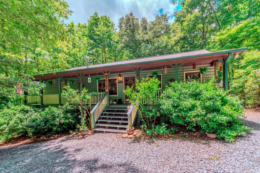 This 3BR, 2BA country/rustic one-level home is 1,742 sq. ft. and sits on 1.32 private wooded acres. From the inviting covered front porch, you enter a great room consisting of a living room, kitchen, and dining area. The master bedroom has an en-suite bath with a separate shower, jetted tub and linen closet. The 2nd and 3rd bedrooms share the 2nd full bathroom, which is also convenient to the living room -- a perfect setup for guests. Just off the kitchen, which has custom pull outs in the cabinets, are two rooms: a large and cozy sun room with French doors leading to the back deck, and a laundry room which has its own deck access, as well as a pantry. The back deck has plenty of space for dining outdoors, lounging and reading, or games and exercise, all surrounded by natural forest. Just off the deck is a picnic table and a recessed fire pit with a fitted grate for grilling. The front yard is a natural garden with bench seating, encircled by a fully looping driveway, and the back yard is filled with green tranquil forest. The north property border (at the far end of the back yard), is a small but picturesque branch / stream, and right on the other side begins the 150+ acres that make up Fightingtown Creek Nature Park, which features 12 miles of hiking and biking trails and is freely open to the public. This beautiful home in a natural setting is less than 10 miles away from the city of Blue Ridge, one of North Georgias most sought-after destinations.