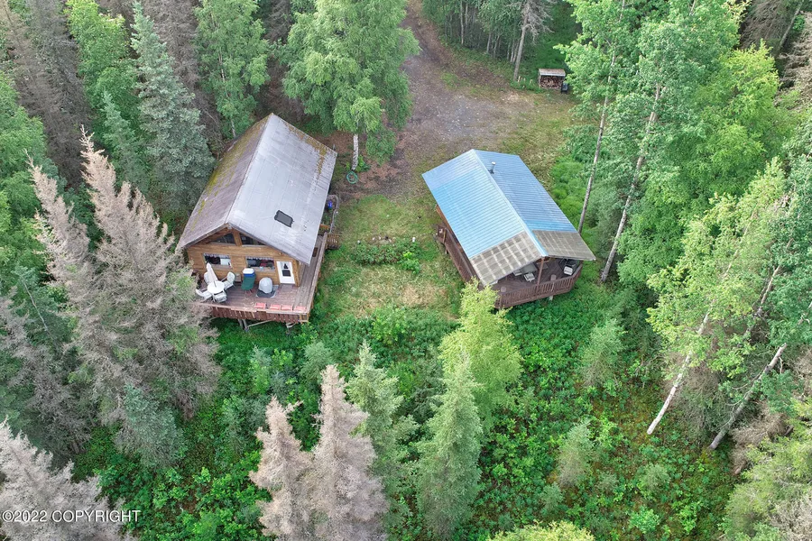 2 SUMMER RENTAL CABINS on 1.32 acres w/peek a boo mtn view. BABY BEAR cabin is 384 sf w/1 bedroom, full bath & deck. PAPA BEAR Chalet is 726 sf w/loft. 2 bedrooms & full bath +large deck. Has a rolled roof now BUT all the materials to replace w/metal roof stays for the buyers. Gated driveway, shared well & shared septic, fish smoker & fish freezers. TURN KEY, fully furnished. Cash only, as-is.'