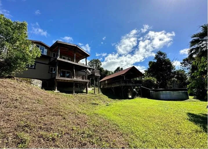 OWNER FINANCING OPTION AVAILABLE!!! Sitting on 1.33 acres of beautiful land, 2,101 square foot home and a 464 square foot guest house. Guest house is fully ready to move in, built mainly from redwood and has an ipe deck,covered lanai. 1 bed 1 bath, tiled floors with carpet bedroom. Newly remodeled with brand new kitchen, bathroom, living room. Attached storage area underneath lanai for yard equipment or tools. Main house has open permit, outside is mostly finished with a two story lanai with E-trex decking. Inside is wired and plumbed ready for your own touches to add or change. See pictures. A nice rock wall foundation awaits outside for a nice hot tub. Property has over 50 different fruit trees including avocado, sapote, macadamia, guava, orange, lemon, lime, grapefruit, kumquat, banana, soursop, rollinia, cinnamon, lillikoi, jackfruit and more. 20,000 gallon water tank for plenty of w...