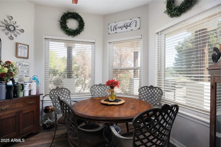Welcome to this storybook 3-bedroom, 2-bathroom country farmhouse, complete with three additional flex rooms perfect for a craft space, guest quarters, or private home office. Set on over an acre with irrigation rights in the sought-after Chandler Citrus Heights community, this charming wraparound-porch home blends timeless appeal with thoughtful modern updates. Inside, you'll find coffered ceilings, a remodeled kitchen with rich cabinets, gleaming granite countertops, and a new garage door with opener. Durable LifeProof flooring runs throughout, while fresh exterior paint keeps everything looking crisp. There is 220-amp service in both the garage and the additional shop/shed perfect for hobbies, projects, or a home business. Bring your horses, enjoy the shaded porch and enjoy the AZ sun.