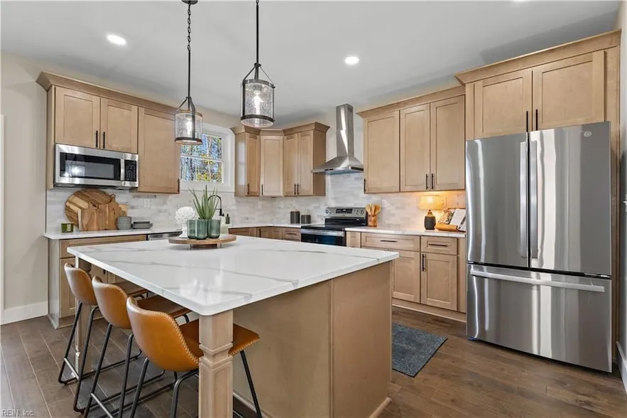 New & MOVE-IN-READY on 1.34 acres featuring open living/ dining/ kitchen, mudroom, full bathroom and flex room (could be office or bedroom) on the 1st floor. Custom Kitchen with 42in cabinets, tile backsplash, upgraded Quartz countertops, Stainless Steel appliances, walk-in pantry and large island. On the 2nd floor you will find 3 bedrooms with walk-in closets, large full hall bathroom and laundry room. HUGE Primary Suite on the 2nd floor with spa like bathroom with dual shower heads in tiled shower, dual vanity with lots of storage and a walk-in closet. 3rd floor is 5th bedroom or huge Media room with walk-in closet and full bathroom. 1st floor LVP flooring, Capet in the bedrooms, all bathrooms to have LVP or tile and granite countertops throughout. 12x12 deck off the back door. So many beautiful high-end features. Only 15min to Downtown Smithfield & 28 min commute to Newport News!