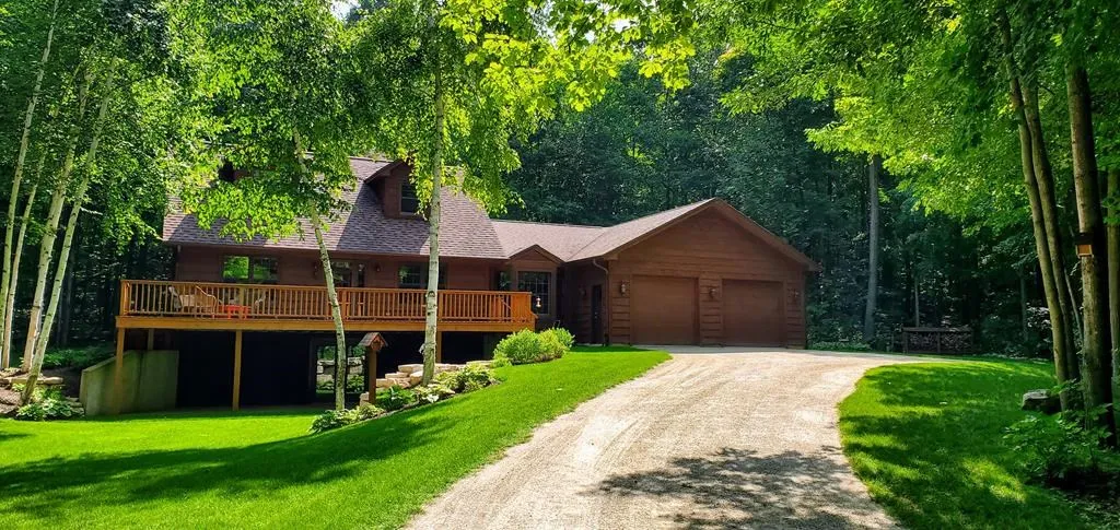 Impeccable cedar log sided home in the woods located 1.5 miles from Horseshoe Bay (sand beach) and 5 1/2 miles from Egg Harbor. Comfortable floor plan with first floor master, 2 guest rooms & bath upstairs, attached oversized garage (insulated with furnace that is not hooked up), Ash floors, built in shelving in closets, full dry basement, and spacious deck. Quadrafire fireplace (lots of firewood incl) insert keeps electric bills low (seller reports avg $130-$200 per month). Many updates including stove, refrigerator, heaters & thermostats, water heater & softener, bathroom updates, and more (see Update list). Frontier DSL internet. A great Door County getaway or year round home. Closing or occupancy 9/29/23