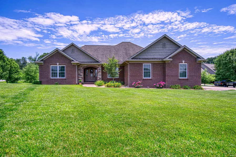 LAKE FRONT- Brick ranch features 3 bedroom, 2 full bath split bedroom/open concept design boosts approximately 1900 sq ft of living space. The great room consists of 9' ceilings is graced by gas fireplace with cabinetry, hand scraped flooring along with a breathtaking view of the lake. Large kitchen is showcased by Amish cabinets, quartz countertops, ceramic backsplash, pantry along with porcelain tile flooring and nook area that leads onto the covered back porch. Oversized primary suite has tray ceiling, 2 walk-in closets ensuite highlighted with soaking tub, sand-up shower and double vanities. Large sideload garage has utility sink. Energy saving heat pump with an average monthly bill of $138!!! Additional amenities include: 10x10 shed with electric, AHS 1 Year Home Warranty, share lake plus more!