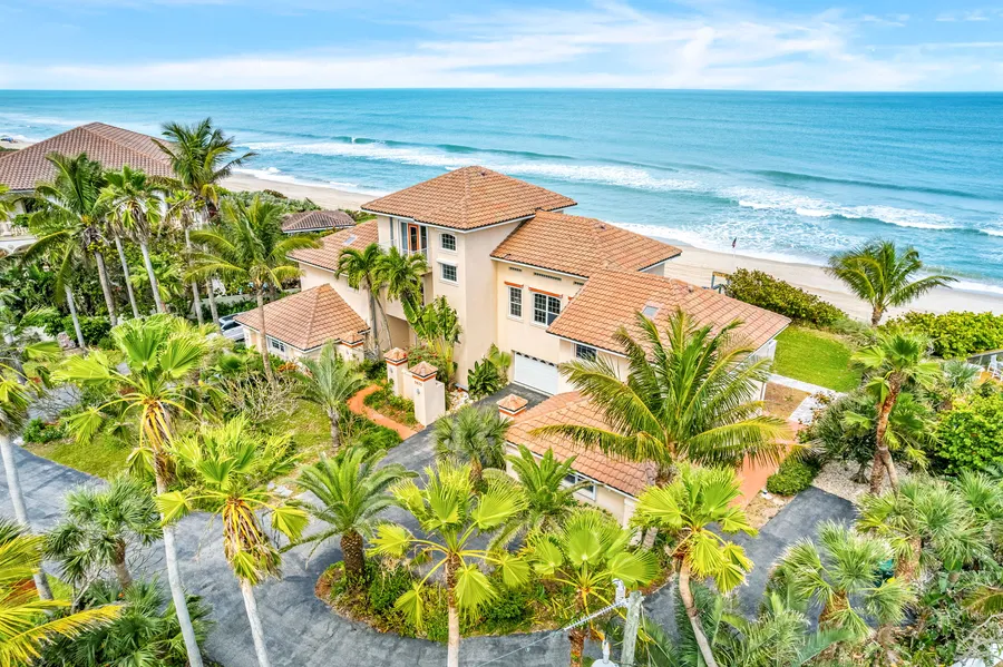 SEASIDE ESCAPE is a one of a kind, 1.36 acre property w/ 165 ft of pristine, South Melbourne Beach direct Ocean frontage. Tropical, private setting, set back from A1A, with multiple use options. Currently all 3 units being utilized for vacation rentals. Main home features 4 bed/3 Baths with open living area, an oversized 2 car garage, dramatic 700 sq ft Master Suite w/ balconies on the East and West side and 2 large Oceanfront balconies off the main level. The two side unit townhomes are each 2 bed / 2 bath with single car private garages and Oceanside balconies for each. Gigantic, Oceanfront pool w/ heated spa and a large deck area. Shown by appointment only.