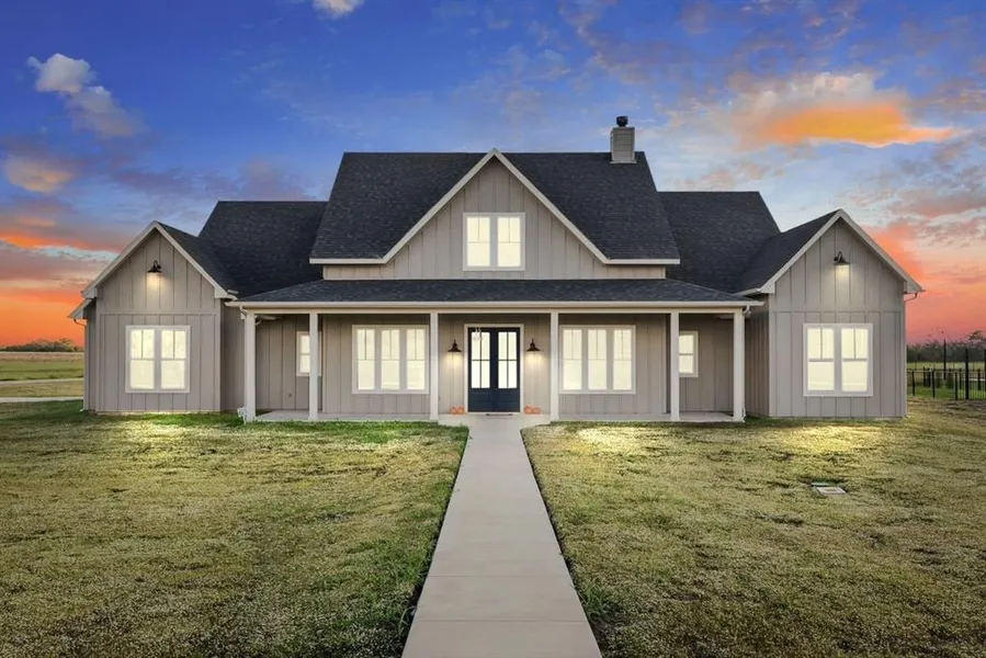 Experience luxury country living with this 4 BR, 3.5 bath farmhouse within Caddo Mills ISD. Boasting 1.36 acres outside city limits, this property offers solitude among open spaces! Dining boasts vaulted tray ceiling with cedar beams. Gourmet, eat-in kitchen with custom cabinetry, large island, stainless appliances with oversized gas range. Living area is spacious, with vaulted ceilings. The combination of a wood-burning fireplace and beautiful granite counters add warmth to the farmhouse ambiance. Disappear to your resort style primary suite. Ensuite presents separate vanities, garden tub & sizeable shower. Secondary bedroom with ensuite, others with jack and jill. Back patio is astounding with gas lit wood burning fireplace providing peace and tranquility. Beyond the sleek curb appeal of this property, you'll uncover countless more unique details. Home is equipped with solar panels. Cl...