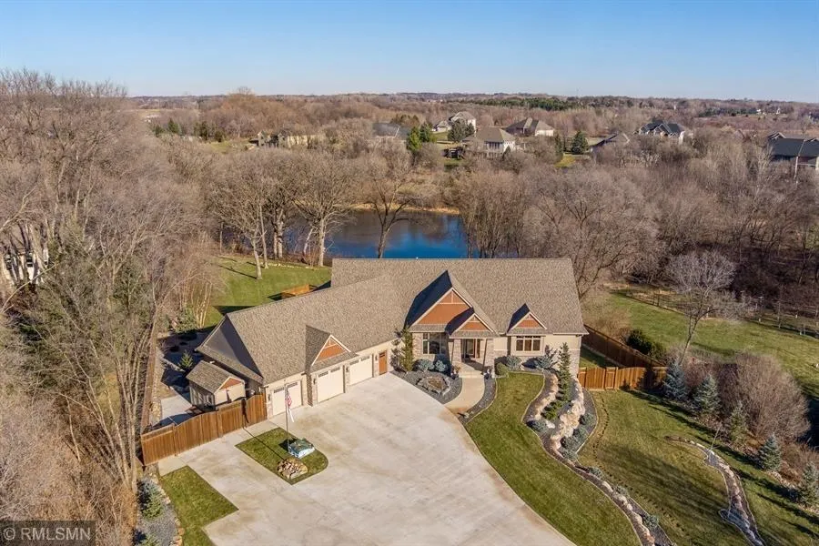 Exceptional executive rambler: stunning 11' ceilings and amazing acreage views of lavish landscape surrounding in-ground pool extending to pond. A beautiful treed barrier provides this oasis complete privacy. Entering front door you're greeted by open layout & window views to back pond. The gourmet kitchen includes large island, walk-in pantry and flows into great room with stunning 2-sided fireplace. Retreat to sunroom or enjoy large deck overlooking landscaped grounds, pool and pond. The owners suite is a showcase remodel. Stunning ceilings; massive custom closet; bathroom ensuite with white quartz, porcelain floor, glass river rock design. Entertain in walkout lower level wetbar, sprawling family room, game area, and panoramic views. New 7' privacy fence with 2 stately gates for vehicle side access. Massive 1,388sqft garage with radiant heat. No cost spared, top of the line: roof, gut...