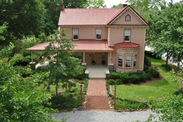 Charming, renovated vintage character home is truly an eye-catching classic, from its distinctive & cheerful peach-pink exterior & Folk Victorian architecture to its lacy dentil accents, colorful metal roof & rich landscaping. The c.1885-built, 5000sf Kinard House offers 4 bedrooms/4 baths & has served its owners well as a Bed & Breakfast Inn. Many furnishings, decor items & all the accoutrements you need to run a B&B are available. The home could serve equally well as a beautiful & comfortable private residence. Painstakingly & lovingly restored from top to bottom. An attractive front approach leads up to its wrap-around front porch. In traditional style, you are welcomed into a wide, tall entry. The informal 17x15 gathering Den beckons to your right featuring a graceful bowed window area. A formal 17x15 Parlor/LR on your left is graced w/ beautiful beveled glass French doors upon entry & another set leading to a grand 16x20 DR. Your private eat-in kitchen has gorgeous butcher-block counters, large ctr island, gas stove, inset fridge, historical brick accent, & handy walk-in pantry. Adjacent utility room has W/D, giant pantry cabinet & utility sink. A Master Suite is located on the 1st floor, which can easily double as either the Owners Retreat, a special B&B Suite or In-law Suite. This private Suite has an easy step-in rectangular shower, walk-in closet & an adjoining 15x13 lounge/LR w/ a gas-insert fireplace & French doors. Upstairs, another wide foyer provides comfortable common space for 3 more spacious 17x15 bedrooms, including another potential Master bed/bath combo w/ a cheerful bright bath that encourages you to linger & relax. Both up & down foyers access pretty, full-baths. Enjoy beautiful heart pine floors thru-out the home, crown mouldings, 11 ceilings in several rooms & special accents you love to discover such as the colorful stained glass accent in the stairwell, a media closet w/ controls for the music & speakers in the front den, DR & back porch, & natural gas ventless fireplaces (6) inset, unique FP original boxes (8) & character mantels in most rooms. Kinard House has surprisingly excellent storage w/ walks-ins in every bedroom. A huge cedar closet lined w/ cabinetry offers abundant space to store any amount of supplies or themed decorations. An additional family room leads out to a covered wraparound back porch- a quiet & roomy respite w/ an ivy wall & porch swing looking out over the greenery of the back gardens. Residents or guests will certainly enjoy the brick-inlaid patio w/ its grand outdoor brick fireplace standing ready for many evenings of outdoor entertaining. Inside or out, The Kinard House offers a perfect spot for weddings, teas, showers, & other special events. Enjoy natural beauty & easy maintenance w/ level 1.37 acres, dotted w/ perennial flower gardens, veggie & herb gardens, pecan & peach trees, & blueberry bushes. Magnolias define the back property line. Oaks & maples provide shade. Theres even an authentic domed brick dutch oven, (c.1952), adding character to the backyard. A traditional style well-maintained barn is 1000sf of hobbyist heaven- any kind of workshop, concreted-floored, fully powered, lighted, heated, its own half-bath, + a 300 upstairs loft. Loads of open parking and a carport. The Kinard House was designated as a historic place on the National Historic Registry in 2007. A National Registry listing places no obligation on private property owners & there are no restrictions on the use, treatment, transfer or disposition of private property. However, there may be opportunities for federal &/or state tax benefits & preservation grants! There are only about 85, 000 historic places listed in the United States