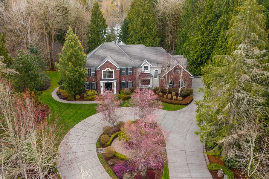 A circular drive opens toward the residence, with manicured landscaping curating a sense of serenity from the moment of arrival. French doors whisk you into the grand foyer with vaulted ceilings and chandelier—offering a glimpse of the sophisticated elegance and craftsmanship felt throughout the home. Brazilian hardwoods and crisp millwork lend warmth and character, while expansive windows allow natural daylight to flood the interior. Surrounded by mature growth trees, you’ll be treated to picturesque views of greenery and privacy.