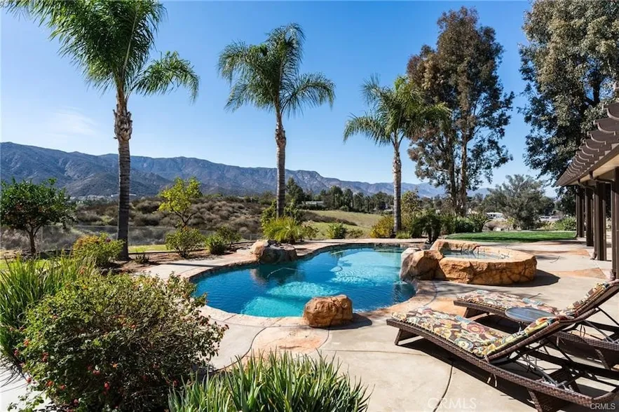 Single story home in Wildomar with a 280 degree panoramic view with mountains to the west and rolling hills to the east. The remodeled kitchen features a large center island, granite counters, and custom cabinetry. The primary suite is spacious, and both bathrooms have been recently remodeled. A home office is conveniently located just off the dining and living rooms. The backyard is designed for entertaining with a pebble tech pool with beach entry and reef, spa, covered patio, and an outdoor BBQ area with a wood fired pizza oven. Additional improvements include an above ground garden with sink and an insulated 12 x 24 metal storage shed. The 1.37 acre lot is fully fenced with RV parking and hookups. Property is serviced by both well water and city water. This home has an incredibly LOW TAX RATE of 1.03%