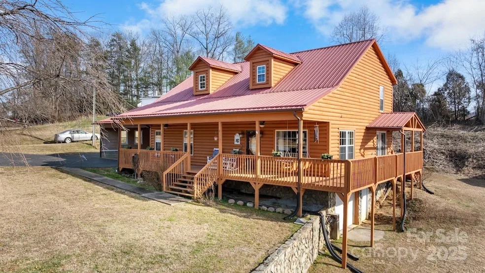 Country, rustic living on 1.39 Acres. You will fall in love with the large wrap around porch on this well maintained log home. As you enter, you will be greeted with towering ceilings and a loft area overlooking the living room. The open floor plan is great for family gatherings or entertaining. The kitchen has a bar area, double ovens, SS appliances and a walk-in pantry. Main level primary suite and main level laundry. ALL appliances remain including the refrigerator and washer/dryer. Upstairs the loft area provides a great sitting area or second living space. The full unfinished basement offers a single car garage, wood stove and lots of storage area. Large detached workshop and additional storage building. Very spacious fenced lot for dogs.