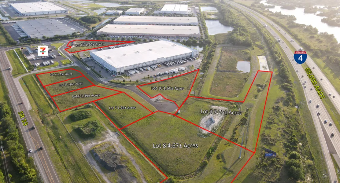PROPERTY DESCRIPTION - Firstpark at Bridgewater is a developed commercial park ideally located at I-4 and SR 33 in Lakeland, FL. Existing tenants in the park include Haverty's, HD Supply, Walmart, Empire Flooring to name a few. The opportunity is to join 7-11 and purchase the developed retail/commercial parcels ranging in size from 1 to 7.75 acres fronting along I-4 and SR 33. The parcels are being sold cleared, filled with the spine road, curb, and offsite master retention already in place. Each pad will include 50 trip count allocation with additional trip count requirements to be purchased at an additional cost. The parcels also benefit from being across the street from the new Florida Polyphonic Connector Road into the growing campus. With over 100,000 cars driving by this property daily, it is prime for hotel, retail and commercial development.