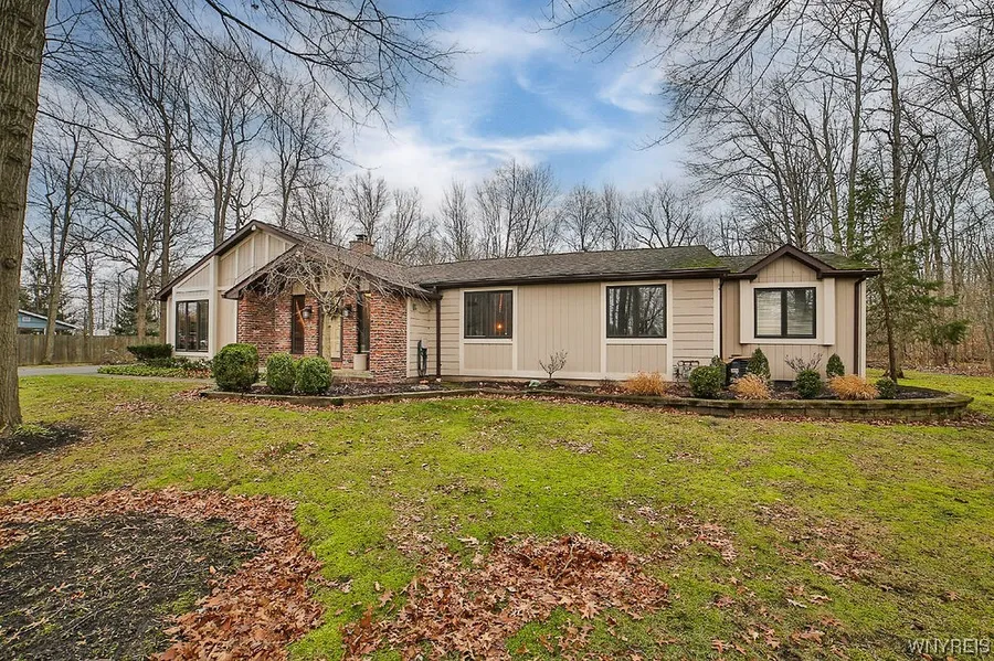 Charm, warmth & elegance. This three BR, three bath ranch in demand Clarence Center is nestled on 1.4 acres & features an open floor plan with so much style! Foyer has tray ceiling w/slate flooring & opens to living room w/cathedral ceiling, gas fireplace & wall of glass o/looking deck, in-ground heated Gunite pool, wooded grounds. The yard also boasts a pool house w/dry bar, vaulted ceiling, gas BBQ, mini fridge, vaulted ceiling & ceramic flooring. Spacious kitchen has an abundance of cabinetry, includes appliances & has cathedral ceiling & skylight at eating area. First floor laundry includes washer & dryer. Stunning primary suite has cathedral ceiling, huge walk-in closet/dressing room & full bath w/ceramic flooring & dual sink vanity. Main bath has marble flooring, vanity w/marble counter & deep soaking tub. The 3rd bath has ceramic flooring, built-in shelving & skylights. Pella windows w/slim shades. Full basement. Central Air. 200 amp electric. Security. Six panel wood doors. Double wide driveway w/turn around. Truly a paradise found!