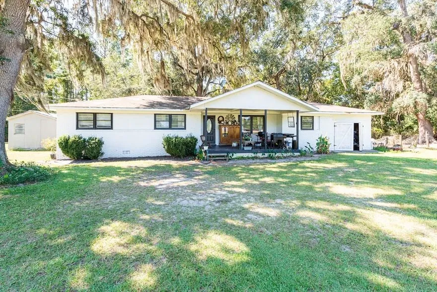 Country living with character! This charming brick home sits on a spacious corner lot, surrounded by shade trees and peaceful privacy just minutes from town. Inside you'll find 3 bedrooms, 1.5 baths, and a cozy vibe throughout. Step outside to a big front porch perfect for relaxing, plus a separate tiny home ideal as a guest house, in-law suite, or fun hangout. A garage offers extra storage, and there's even a small creek along the back edge. With room to spread out and plenty of potential, this one is full of rural charm! Farm animals are not included in the sale, but you can create your own dream homestead!