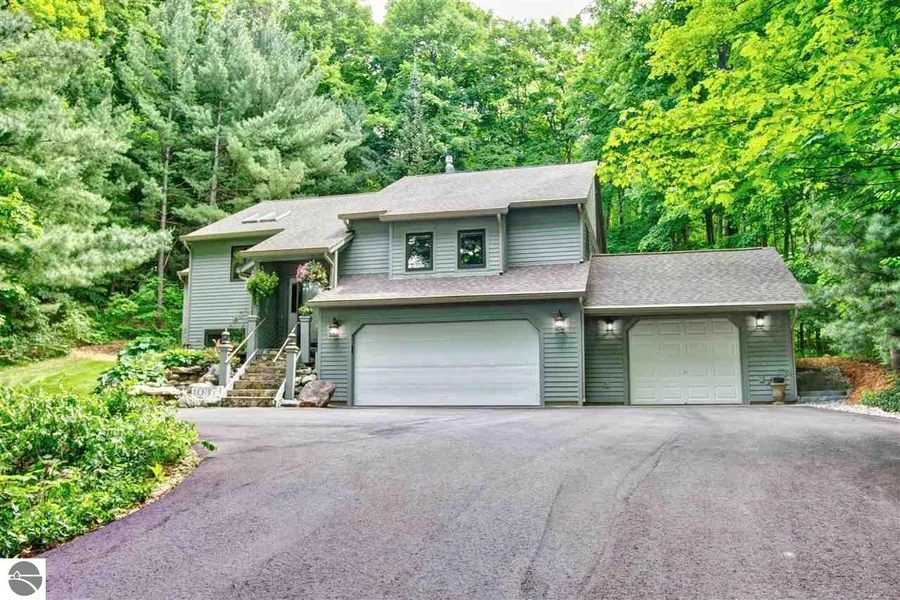 Set in an alcove of mature woods just a short walk from its boat slip on 270' of shared Long Lake frontage, this impeccably maintained home is anything but cookie-cutter, both in amenities and quality. A lovely landscaped fountain greets you on arrival and creates an instant feeling of tranquility. The foyer opens to a beautiful living room under beamed cathedral ceilings, anchored by a stone gas fireplace and triple-pane patio doors with built-in blinds, overlooking the deck. You'll love the gleaming hardwood floors and moldings, created from a tree on the property itself. Granite counters grace the kitchen and a tongue-and-groove ceiling adorns the formal dining room - both rooms feature skylights to usher in generous natural light. You'll find three bedrooms on the main level, including the primary bedroom which hosts a private bath with dual shower heads in the tiled shower shall. A laundry chute is located near the bedrooms for the ultimate in convenience. In the lower level you will find a family room, fourth bedroom, another full bath and sauna, along with the spacious laundry room with an adjacent office. There is plenty of storage in the 3-car garage with epoxy-coated floors for easy cleaning. Privacy is yours on the back deck which overlooks the wooded lot - grill dinner (there is a natural gas grill hook-up) and eat outside, or melt away your stress in the hot tub. This property comes complete with a generator hook-up as well. It is also one of only 18 properties in the subdivision with shared frontage and a boat slip on all-sports Long Lake.