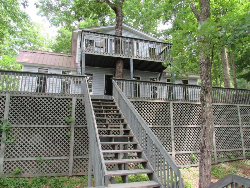 Become one with nature at this incredible lake house on Wood Creek Lake. The multi-level deck was designed and built to surround massive magnolia, birch, oak and poplar trees, leaving room for these natural pillars to grow in size and beauty. Home has breathtaking lake front views with two covered docks for fishing, boating, jet skiing, picnicking, etc. Home has a two car detached garage with two entry ways to the driveway. Modern, open floor plan with a stunning wooden planked staircase. Living area boasts a rock garden with room for an abundance of plants to live inside. *This special investment property has mega potential and is priced to sell as is with the option of owner financing the renovations. Will not approve for FHA, VA, Rural. Call agent today for your private showing!