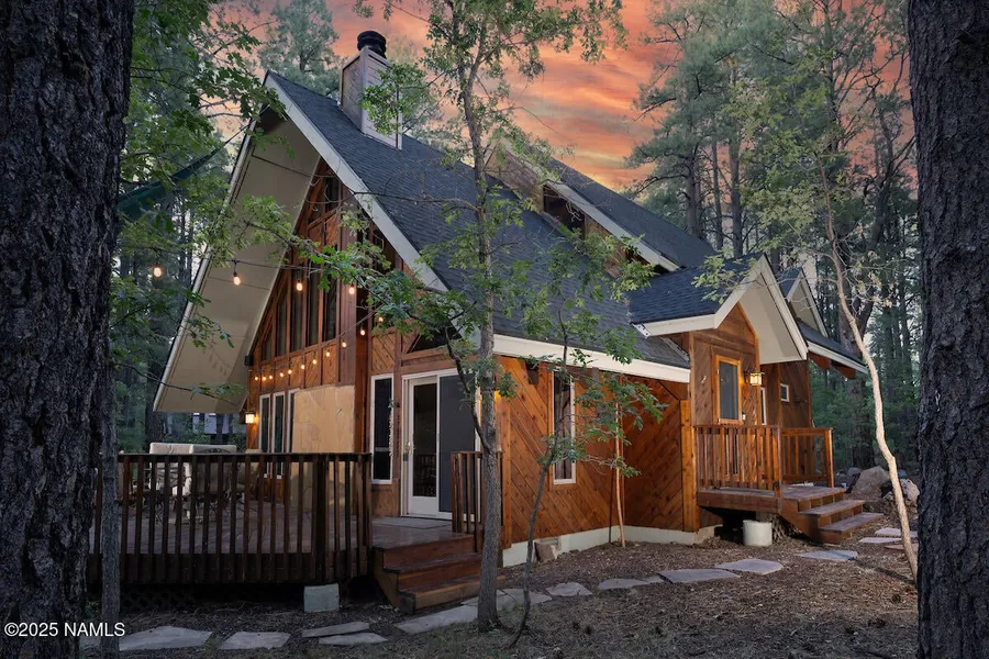 Come enjoy peaceful Mormon Lake with this custom built exposed timber home on 1.5 acres! Enjoy the the screened in porch, large deck looking out over the forest, outside fire pit to enjoy the cool evenings and abundant wildlife. This home was designed by an architect specifically for the property and custom built with exposed Timbers. Inside enjoy the cozy fireplace, flagstone floors, large windows designed for afternoon warmth, 2 bedrooms and a bath downstairs, another bedroom and bath upstairs. Roof replaced in July of 2025, recently stained decking and cedar siding. Abundant wildlife, hiking, off roading, fishing and unlimited forest service access. Don't miss out on this amazing property located in the Pines.