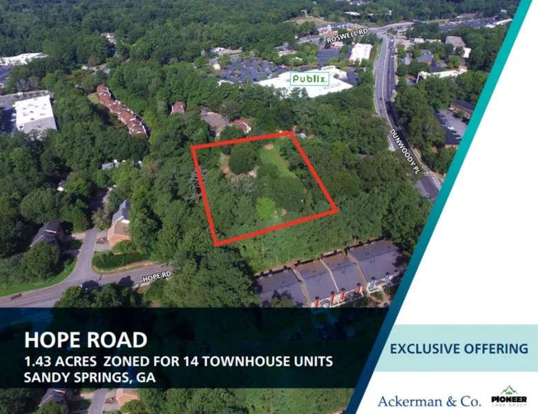 The 1.43 acres on Hope Road is zoned for 14 townhouse units located in the city limits of Sandy Springs. Less than 1 mile from Ga-400, the property on Hope Road is served by the North Springs High School District.