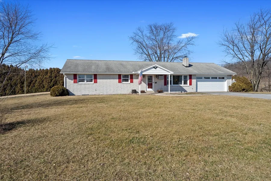 Fantastic Brick Rancher on 1.43 country acres nestled on the crown of a hill overlooking the countryside. This beautiful Ranch home boasts 5 private bedrooms, 2.5 bathrooms with a 2-car oversized attached garage, a detached 1 car oversized garage and a finished basement that could be an in-laws area. If you are looking for 1 floor living at its finest.... look no further. The first floor has 4 private bedrooms with hard wood floors, 1.5 bathrooms, a first-floor laundry, large living room with a fireplace and wood insert for secondary heating source, spacious kitchen and dining area. The basement offers a huge family room with a wood burning fireplace, a large second kitchen area and a private room that could be a 5th bedroom or home office. The rear yard is semiprivate with mature landscape and a detached garage could be a work shop or a mechanics dream. This Ranch home has it all!