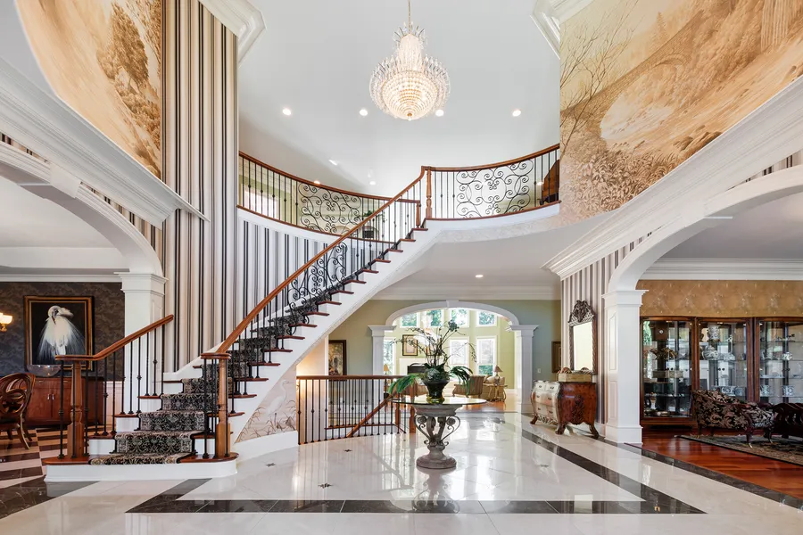 The imposing faade embraces a welcoming yet stately portico and flanking terraces. Custom double front doors capped with an impressive transom-style window open to the dramatic foyer, where a soaring 24-foot ceiling, resplendent crystal chandelier, inlaid tile floor, and gracefully curving staircase rising to a second level gallery combine in breathtaking harmony. The pi ce de r sistance of this glorious space, however, is a hand-painted panoramic mural by noted painter and sculptor Hans Boye Boyeson.