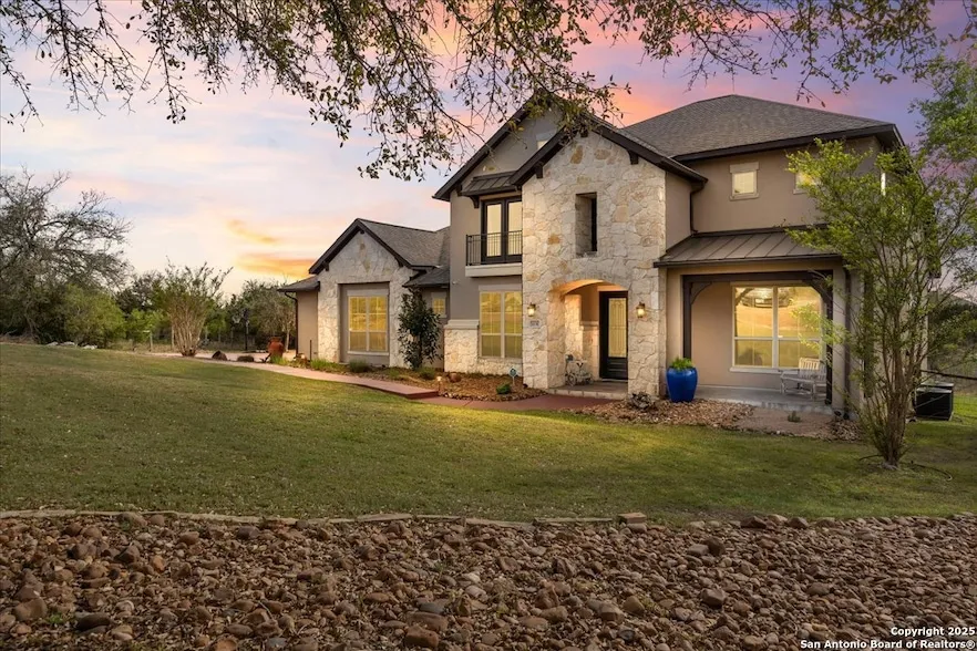 Step into the beauty of this breathtaking Hill Country estate, nestled on a cul-de-sac with 1.44 acres in the welcoming Vintage Oaks Subdivision! Imagine starting your day with a cup of coffee by the outdoor chimney on the charming front porch or unwinding on the covered patio, where the lush greenbelt brings nature's serenity right to your doorstep. Indulge in ultimate relaxation by the custom-designed pool and spa, or gather with loved ones in the delightful outdoor kitchen, complete with a picturesque wooden pergola-perfect for hosting unforgettable get-togethers. Spanning 4,915 square feet, this magnificent five-bedroom home in New Braunfels is thoughtfully designed with luxury and comfort in mind. Soaring 20-foot ceilings and a striking floor-to-ceiling stone fireplace create a warm, inviting ambiance. The grand living area, bathed in natural light from a wall of windows adorned wi...