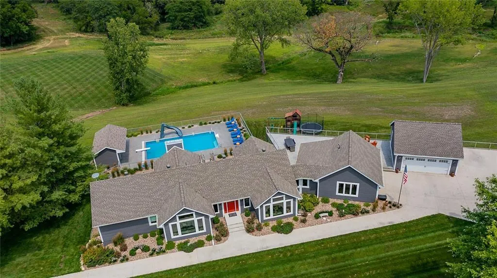 Prime Waukee location! Delight in picturesque views of rolling hills, Sugar Creek and timber! 4BR w/o ranch was completely remodeled in 2017. Spacious mudroom/laundry/drop zone w/ lockers and cabinet storage is a dream! Dining room feat vaulted ceiling + shiplap. Kitchen boasts quartz, a huge island for seating, bar area + views/access to the composite deck w/ custom rail, sunken hot tub + heated, salt water 20x40 inground pool! Beams and shiplap ceilings are inviting, stone accent wall w/ gas fp makes the living room super cozy. Retreat to the master suite and immerse yourself in the spa-like shower + custom walk-in closet. Walkout LL is home to 3 BR and 2 baths, with a family room + fireplace. Play area w/ storage could easily transition to office space. Exit to the stamped concrete patio; play hoops or entertain a crowd! Pool house stores the toys/mechanicals and incl 1/2 bath for con...