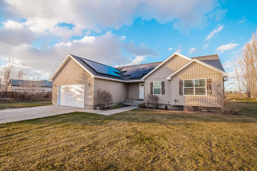 Come and see this beautiful home on 1.46 acres with irrigation water. Animals allowed! Installation of solar panels have virtually eliminated electric costs for this property, and have even resulted in credits from the power company. You'll love the built-in bookcases, central air, and cozy fireplace. Basement is plumbed for a second fireplace, and is equipped with a storage room. You'll be pleased to find a sprinkler system as well as community flood irrigation, a garden spot, shed, children's play set, 3 varieties of apple trees, a peach tree, as well as plum, apricot, and cherry trees. Seller is willing to include a carpet allowance at closing. Call for your showing today!