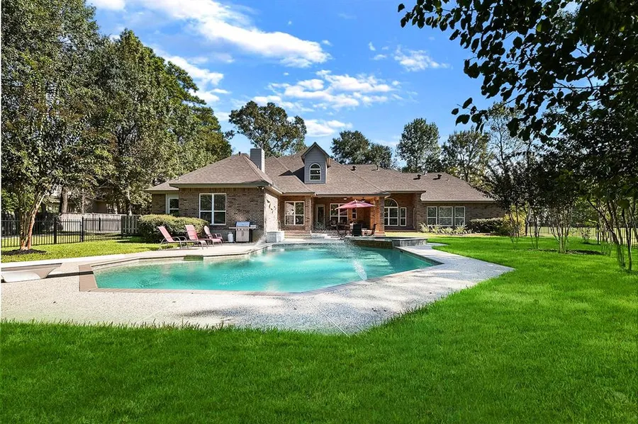 Beautiful custom 1.5 story home in the Lake Windcrest golf course community. All bedrooms are on the first floor of this 4 bedroom/3.5 bath home. A large game room, storage or craft room, and huge attic are on the second floor. This home has a formal dining room, study, den and a spacious gourmet kitchen that is open to the family room and eating area. The kitchen has a large island, granite counter tops, a pantry, and lots of cabinet space ;perfect for the chef in the family. The laundry room is very spacious. The luxurious master suite has a separate tub and shower and walk-in closets with custom built-ins. Two of the secondary bedrooms share a Jack and Jill bathroom. This fabulous home is situated on 1.46 private acres, with many trees and landscaping next to a permanent 10 acre, green reserve. The property has a beautiful pool and spa with plenty of privacy and a 30x40 building ideal for RV/boat storage and a workshop. Come see this dream home today before it is gone!